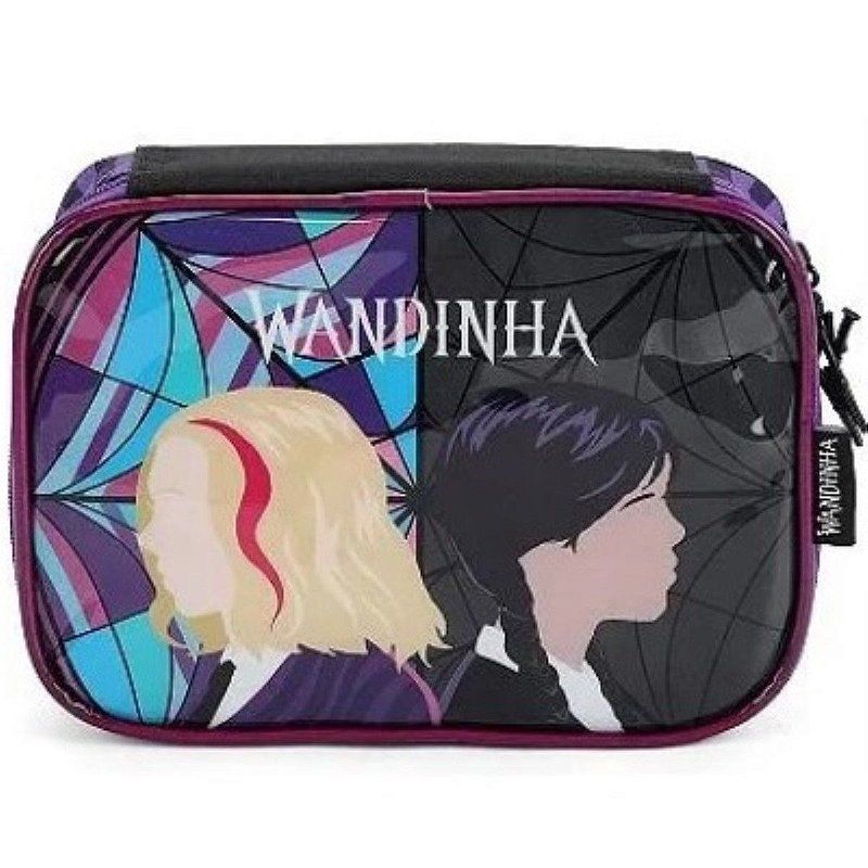 O estojo box da Wandinha possui um compartimento, divisória com elásticos para lápis, acabamento em glitter, zíperes personalizados e uma estampa lindíssima do personagem. A marca luxcel é famosa pelo material resistente e beleza dos produtos.