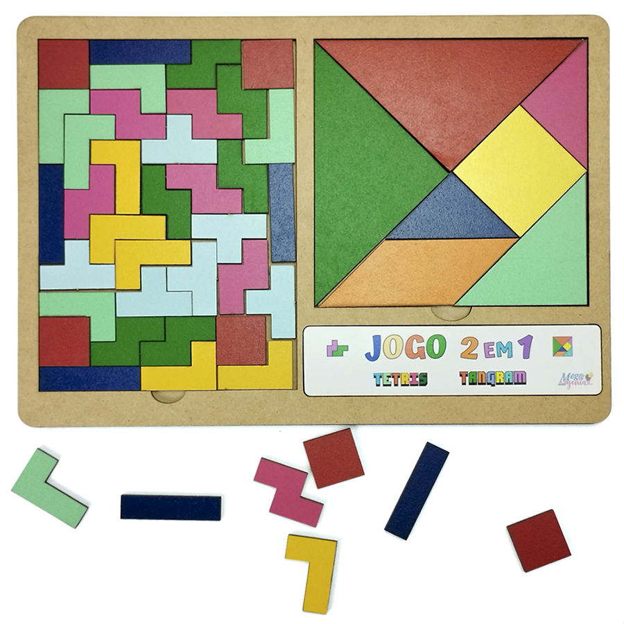 Estimule o raciocínio lógico, a criatividade e a coordenação motora das crianças com o Brinquedo Educativo 2 em 1 Tetris + Tangram! Com design colorido e peças em madeira de alta qualidade, este tabuleiro oferece duas atividades clássicas em um único brinquedo: Tetris de encaixe e o tradicional Tangram.